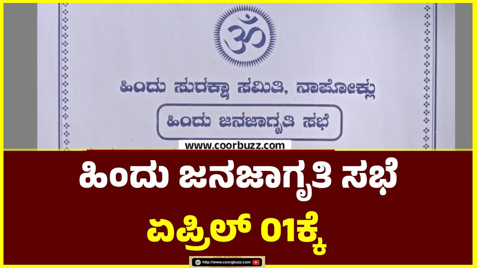 ಮಡಿಕೇರಿ : ನಾಪೋಕ್ಲು ಹಿಂದು ಜನಜಾಗೃತಿ ಸಮಿತಿ ವತಿಯಿಂದ ʼಹಿಂದು ಜನಜಾಗೃತಿ ಸಭೆʼ ಏಪ್ರಿಲ್ 01ರಂದು ನಡೆಯಲಿದೆ. ಅಂದು ಬೆಳಗ್ಗೆ