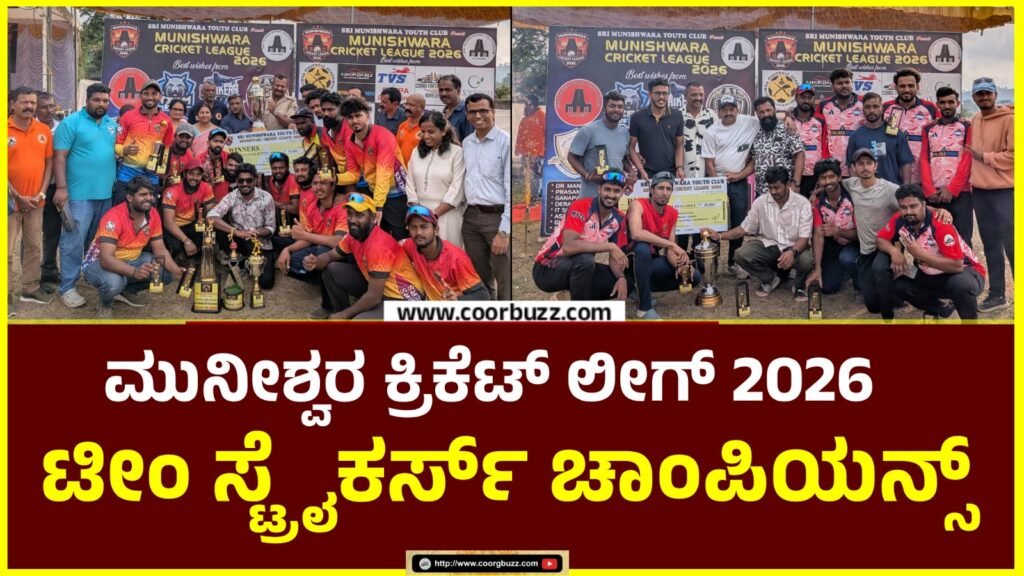 ಮಡಿಕೇರಿ : ನಗರದ ಮುನೀಶ್ವರ ಯುವಕ ಸಂಘದ ವತಿಯಿಂದ ಆಯೋಜಿಸಿದ್ದ ʼಮುನೀಶ್ವರ ಕ್ರಿಕೆಟ್ ಲೀಗ್ 2026ʼ ಪ್ರಥಮ ವರ್ಷದ ಲೆದರ್ ಬಾಲ್ ಟೂರ್ನಮೆಂಟ್ ಚಾಂಪಿಯನ್ ಆಗಿ ಟೀಂ ಸ್ಟ್ರೈಕರ್ಸ್ ಹೊರಹೊಮ್ಮಿದೆ. ಜನರಲ್ ತಿಮ್ಮಯ್ಯ ಜಿಲ್ಲಾ ಕ್ರೀಡಾಂಗಣದಲ್ಲಿ 08 ದಿನ ಕಾಲ ನಡೆದ ಟೂರ್ನಮೆಂಟ್ನಲ್ಲಿ ಜಿಲ್ಲೆಯ ಪ್ರತಿಷ್ಠಿತ 08 ತಂಡಗಳು ಪಾಲ್ಗೊಂಡಿದ್ದವು. ಶನಿವಾರ ಅಪರಾಹ್ನ ನಡೆದ ಫೈನಲ್ ಪಂದ್ಯದಲ್ಲಿ ಎಂವೈಸಿಸಿ ಮಡಿಕೇರಿ ತಂಡದ ಎದುರು ಟೀಂ ಸ್ಟ್ರೈಕರ್ಸ್ ಸುಲಭ ಜಯ ದಾಖಲಿಸಿತು. ಮೊದಲು ಬ್ಯಾಟ್ ಮಾಡಿದ ಎಂವೈಸಿಸಿ 99 […]