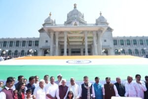 ಬೆಳಗಾವಿ : ಮುಖ್ಯಮಂತ್ರಿ ಸಿದ್ದರಾಮಯ್ಯ ಇಂದು ಬೆಳಗಾವಿಯ ಸುವರ್ಣ ಸೌಧದ ಪಶ್ಚಿಮ ದಿಕ್ಕಿನ ಮೆಟ್ಟಿಲುಗಳ ಮೇಲೆ ಜಗತ್ತಿನ ಎರಡನೇ ಅತೀ ದೊಡ್ಡ ಖಾದಿ ತ್ರಿವರ್ಣ ಧ್ವಜವನ್ನು ಅನಾವರಣ ಮಾಡಿದರು.